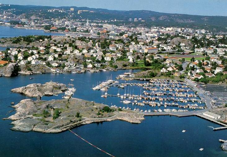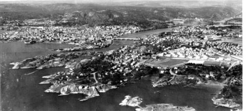 Flyfoto over Kuholmen, Bertesbukta til høyre, ca. 1930.