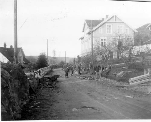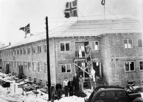Kranselag på murblokka hjørnet Kuholmsveien - Randesundsgate vinteren 1939